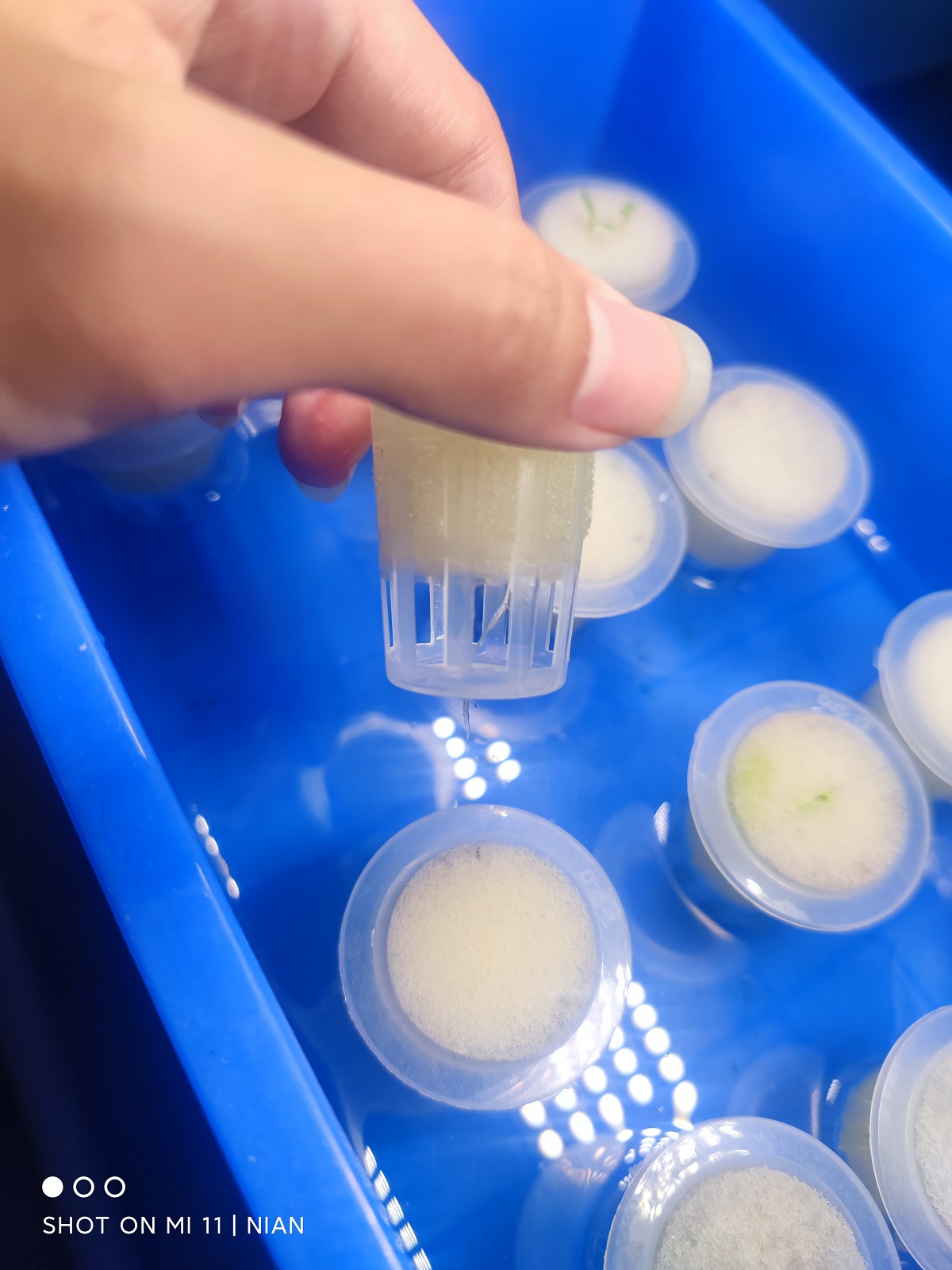 约一周后,大部分种子顺利产生足长的水生根。此时将定植篮放入上盖中,盖上盖子继续培养。